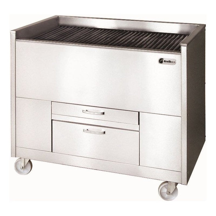 The Grelhaco charcoal chargrills are available in two versions: one for chicken, with a 240mm gap between the charcoal bed and cooking grates, and another for meat or fish, with a 120mm gap.