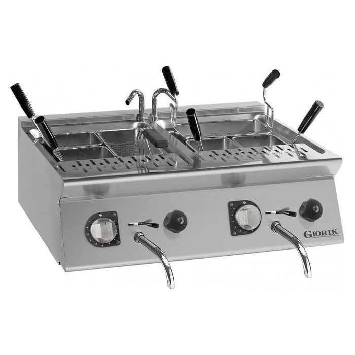 The Giorik 70 Top CPE726T single-tank pasta boiler is perfect for cooking pasta, noodles, vegetables, mussels, and more. Designed for high pasta output, it features a basket drainage area and an overflow to remove excess starch.