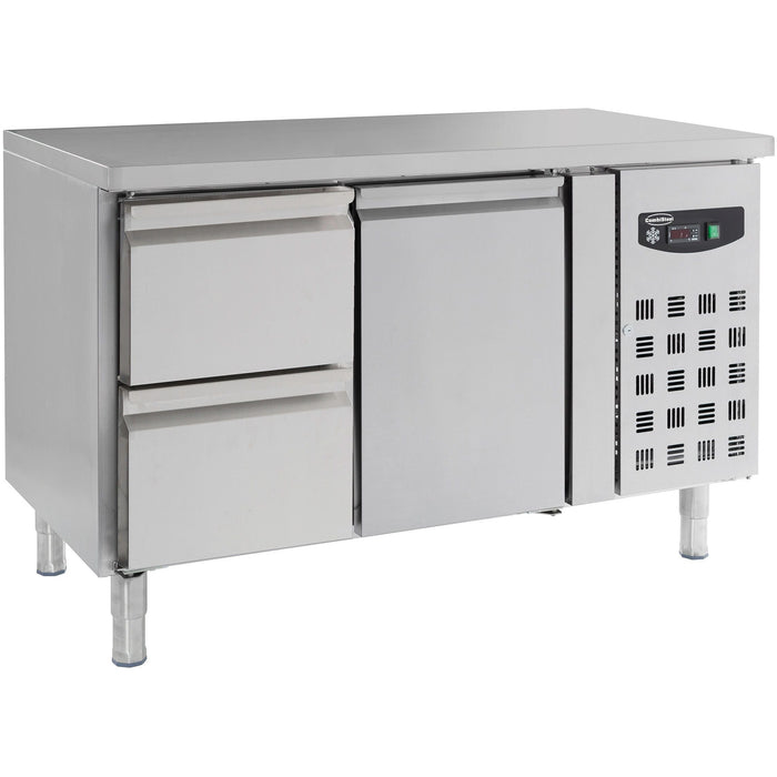 Dim. interior WxDxH (mm) 795x580x560 Type of cooling Ventilated Number of drawers 2 Number of doors 1 Noise level (dB) 42 Defrost Automatic Max. ambient temperature (°C) 38 Contents of GN 1x 1/1 Gross Capacity (Ltr) 282 EAN code 6017429219238 Type Standard Line Width (mm) 1360 Depth (mm) 700 Height (mm) 850 Material Stainless steel 18/8 Gross Weight (kg) 115 Material interior Stainless steel 201 Voltage (Volt) 230 Temperature range (°C) +2/+8 Cooling agent R 600 A Electrical power (kW) 0,34