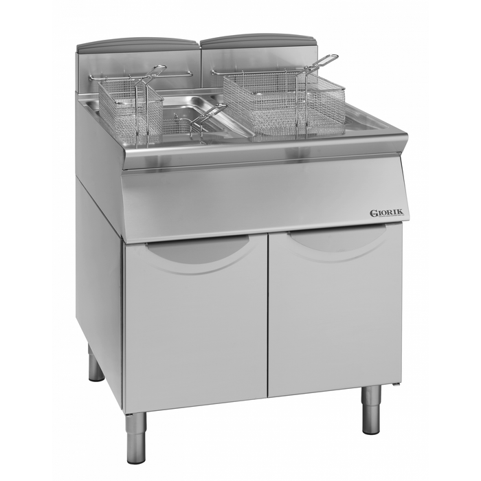 The Giorik FG7215T twin tank gas fryer features internal heat exchangers that reduce fuel costs by directly heating the oil through tubes inside the tank..