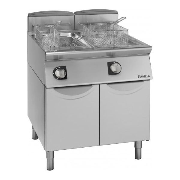 The Giorik FG7217T Twin Tank Gas Fryer features internal heat exchangers that reduce fuel costs by directly heating the oil through the burner tubes inside the frying tank.