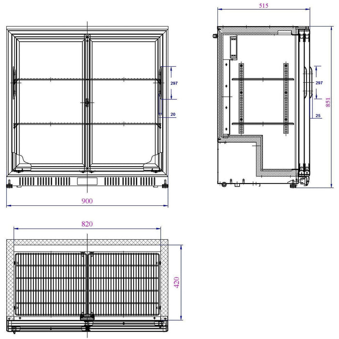 Dim. interior WxDxH (mm) 820x385x700 Lighting Yes, LED Type of cooling Static with fan Lockable No Number of doors 2 Defrost Automatic Max. ambient temperature (°C) 38 Net Capacity (Ltr) 198 EAN code 7422242947920 Width (mm) 900 Depth (mm) 520 Height (mm) 850 Material Gepoedercoat staal Material interior Aluminium Color Black Gross Weight (kg) 72 Power consumption (Kw/24h) 1.56 Voltage (Volt) 230 Electrical power (kW) 0,23 Cooling agent R 600 A Temperature range (°C) 0/+10 Number of grids 4 Insulation thickness (mm) 40