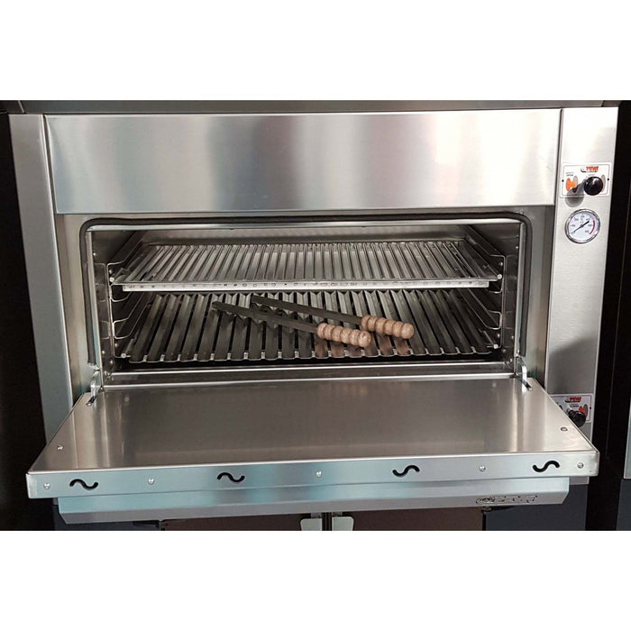 This heavy-duty Peva charcoal-burning oven lets you achieve the authentic flavor of charcoal-cooked food. It can be used as a grill for steaks and other items or as an oven with adjustable shelf heights, making it perfect for restaurants, pubs, hotels, outdoor kitchens, or mobile catering.