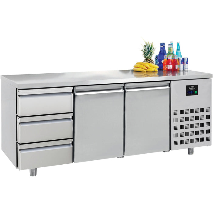 Type of cooling Ventilated Number of drawers 3 Number of doors 2 Noise level (dB) 40 Defrost Automatic Max. ambient temperature (°C) 43 Insulation thickness (mm) 50 Contents of GN 1/1 Gross Capacity (Ltr) 474 EAN code 7422242936962 Width (mm) 1865 Depth (mm) 700 Height (mm) 850 Material Stainless steel 430 Gross Weight (kg) 175 Particulars The doors and drawers are not self-closing. Guides distance (mm) Variabel 40/80/10 Voltage (Volt) 230 Number of guide pairs 8 Number of grids 2 Temperature range (°C) -2/+8 Cooling agent R 290 Electrical power (kW) 0,23 Frequency (Hz) 50