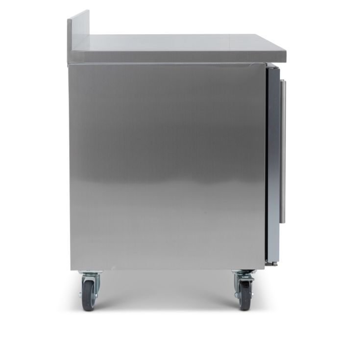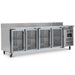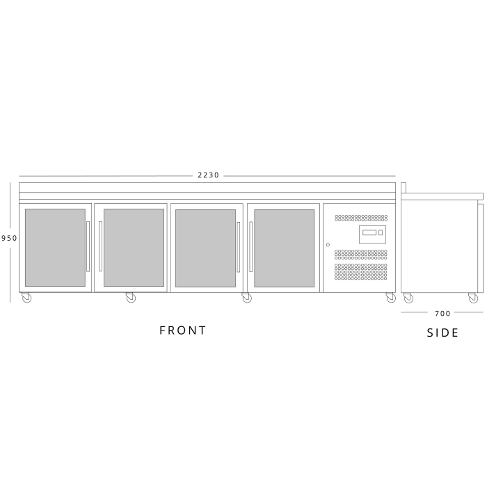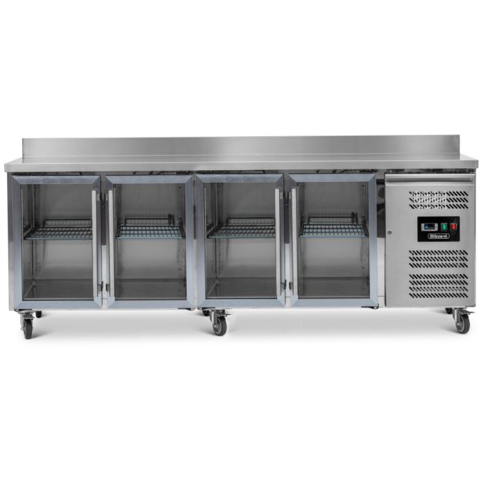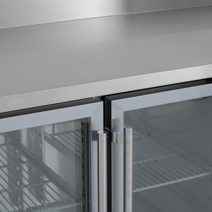 With anodised aluminium surrounds the double glazed glass doors are a perfect fit for the HBC line up. HBC4CR features one adjustable shelf per door, heavy duty castors as standard and a coved 100mm upstand, forming a seamless splashback.