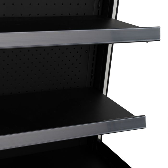 • 4 heavy duty adjustable shelves (300mm deep) with pricing strips