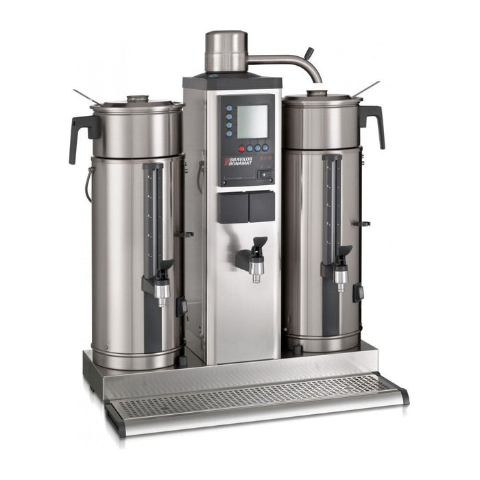 This model has one brewing system, a separate hot water tap, and two 5-liter containers.