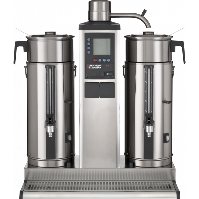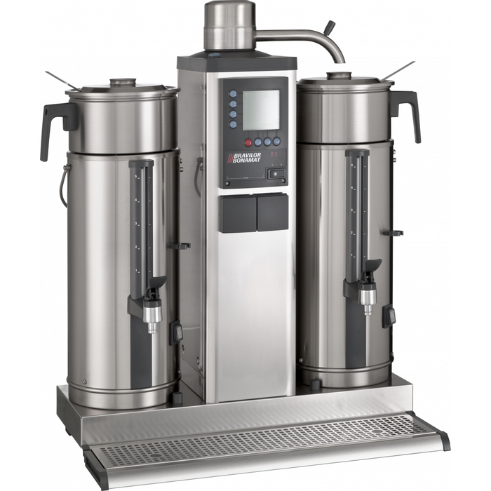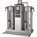 A round filtering machine designed for locations with a water connection, capable of brewing large volumes of coffee into separate containers.