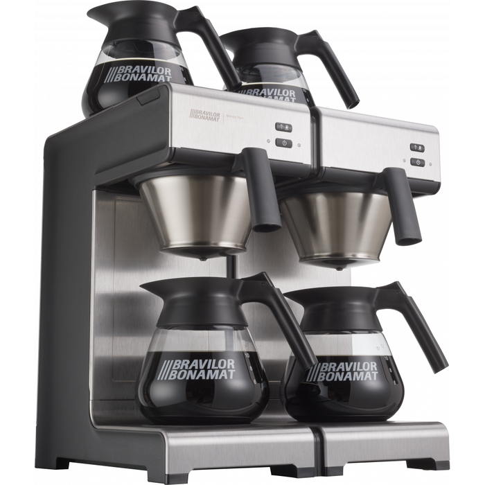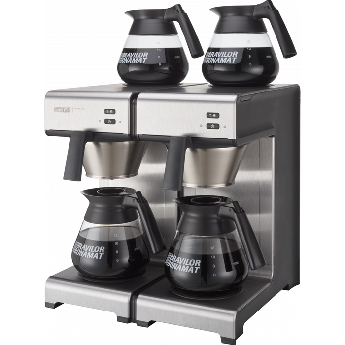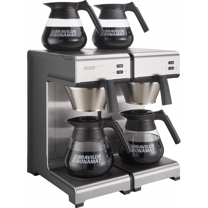 A portable coffee filter machine designed for locations without a water supply. Comes equipped with four decanters and two durable stainless steel filter trays. Features dual brewing systems and four warming plates for convenience.