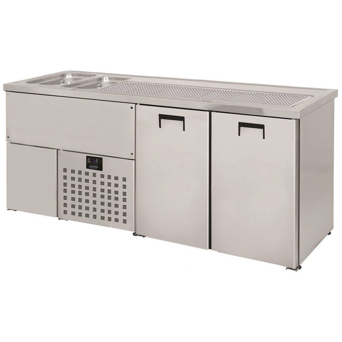 Dim. interior WxDxH (mm) 990x565x795 Grid(s) size WxD (mm) 540x405 Sink dimensions wxdxh (mm) 300x500 Number of doors 2 Defrost Automatic Max. ambient temperature (°C) 43 Insulation thickness (mm) 60 EAN code 7435137842804 Width (mm) 1950 Depth (mm) 700 Height (mm) 950 Material Stainless steel 430 Gross Weight (kg) 225 Particulars Space for 1 beer keg per door when you take out the shelves Voltage (Volt) 230 Number of grids 2 Temperature range (°C) -2/+8 Cooling agent R 290 Electrical power (kW) 0.36 Frequency (Hz) 50