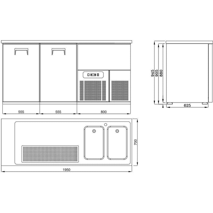 Dim. interior WxDxH (mm) 990x565x795 Grid(s) size WxD (mm) 540x405 Sink dimensions wxdxh (mm) 300x500 Number of doors 2 Defrost Automatic Max. ambient temperature (°C) 43 Insulation thickness (mm) 60 EAN code 7435137841890 Width (mm) 1950 Depth (mm) 700 Height (mm) 950 Material Stainless steel 430 Gross Weight (kg) 225 Particulars Space for 1 beer keg per door when you take out the shelves Voltage (Volt) 230 Number of grids 2 Temperature range (°C) -2/+8 Cooling agent R 290 Electrical power (kW) 0.36 Frequency (Hz) 50