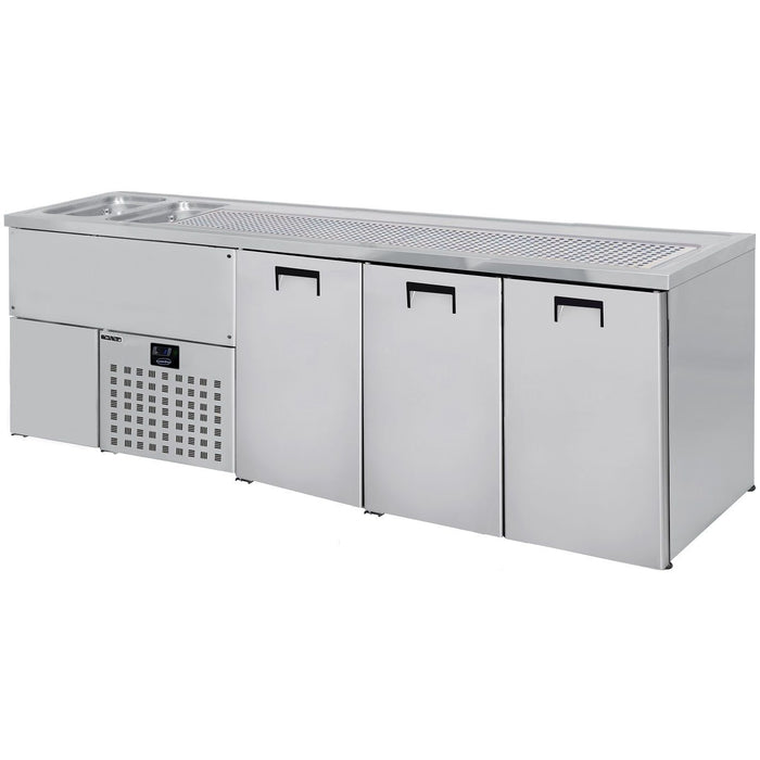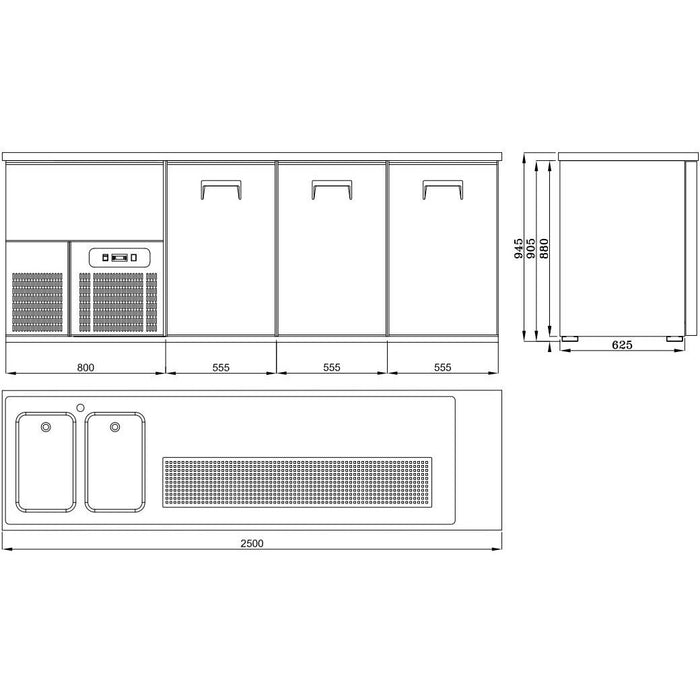 Dim. interior WxDxH (mm) 1545x565x795 Grid(s) size WxD (mm) 540x405 Sink dimensions wxdxh (mm) 300x500 Number of doors 3 Defrost Automatic Max. ambient temperature (°C) 43 Insulation thickness (mm) 60 EAN code 7435137842842 Width (mm) 2500 Depth (mm) 700 Height (mm) 950 Material Stainless steel 430 Gross Weight (kg) 287 Particulars Space for 1 beer keg per door when you take out the shelves Voltage (Volt) 230 Number of grids 3 Temperature range (°C) -2/+8 Cooling agent R 290 Electrical power (kW) 0.46 Frequency (Hz) 50