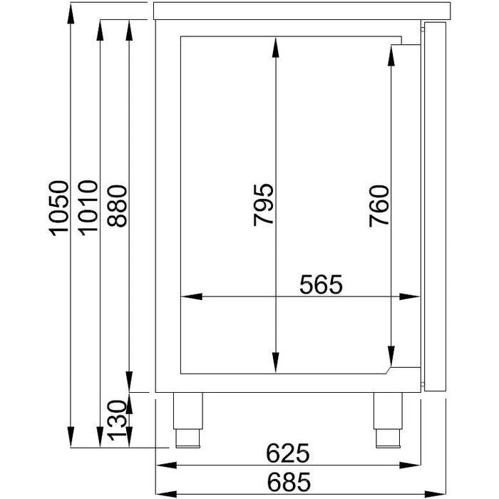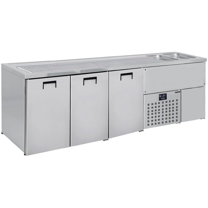 Dim. interior WxDxH (mm) 1545x565x795 Grid(s) size WxD (mm) 540x405 Sink dimensions wxdxh (mm) 300x500 Number of doors 3 Defrost Automatic Max. ambient temperature (°C) 43 Insulation thickness (mm) 60 EAN code 7435137842835 Width (mm) 2500 Depth (mm) 700 Height (mm) 950 Material Stainless steel 430 Gross Weight (kg) 287 Particulars Space for 1 beer keg per door when you take out the shelves Voltage (Volt) 230 Number of grids 3 Temperature range (°C) -2/+8 Cooling agent R 290 Electrical power (kW) 0.46 Frequency (Hz) 50