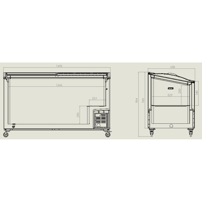 Lockable Yes Mobile Yes Type of cooling Static Insulation thickness (mm) 60 Max. ambient temperature (°C) 35 Defrost Manual Noise level (dB) 45-47 Dim. interior WxDxH (mm) 1366x529x536 Gross Weight (kg) 90 Electrical power (kW) 0,19 Voltage (Volt) 230 Particulars Comes without baskets Color White Material interior Aluminium Height (mm) 879 Depth (mm) 659 Width (mm) 1494 EAN code 7422242940907 Cooling agent R 290 Material White painted steel Temperature range (°C) -18 / -24 Gross Capacity (Ltr) 461