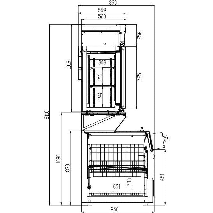 Mobile No Lockable No Type of cooling Ventilated Lighting Yes, LED Number of doors 3 Insulation thickness (mm) 60 Power consumption (Kw/24h) 16 top / 10,3 bottom Defrost Automatic Noise level (dB) 60+60 Max. ambient temperature (°C) 25 Gross Capacity (Ltr) top 546 / bottom 900 Voltage (Volt) 230 Particulars Top ventilated cooling / Bottom static cooling Gross Weight (kg) 391 Color Black Electrical power (kW) 1,29 Height (mm) 2102 Depth (mm) 890 Width (mm) 2104 EAN code 7435137869849 Number of grids 6 Max. grid load (kg) 18 Guides distance (mm) 90 Cooling agent R 290 Number of dividers 4 Temperature range (°C) <-18