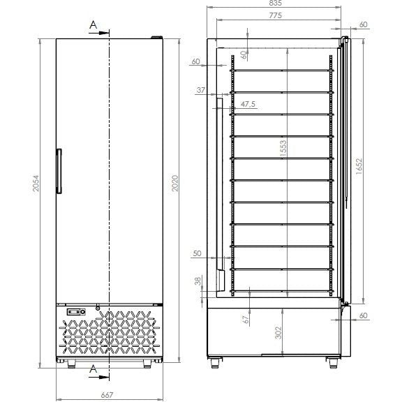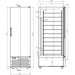 Type of cooling Static with fan Number of doors 1 Dim. interior WxDxH (mm) 547x775x1553 Power consumption (Kw/24h) 8,05 Defrost Manual Door reversible No Max. ambient temperature (°C) 30 Gross Capacity (Ltr) 658 Voltage (Volt) 230 Gross Weight (kg) 150 Accessories included 5 shelves Electrical power (kW) 0,336 Height (mm) 2020 Depth (mm) 895 Width (mm) 667 EAN code 7435137797739 Number of grids max. 11 of 535x650mm Cooling agent R 290 Temperature range (°C) -15/-25 Capacity in units per time 66X 5LTR