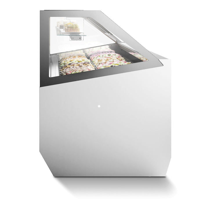The Millennium ST flat glass range of stylish ice cream scooping displays from ISA is a premium cabinet for the professional ice cream retailer. The unit comes in 12, 16, 18, 20 and 24 Napoli pan sizes. The large contemporary flat glass canopy creates a stunning display of all the best flavours, and the ventilated cooling allows the ice cream to be displayed prominently while keeping the ice cream or gelato at the perfect serving temperature. This is an ice cream display for those who want the best. There is also a matching patisserie model to complement the ice cream range.