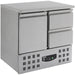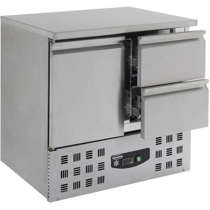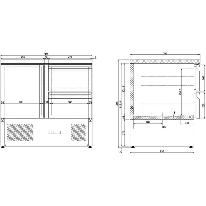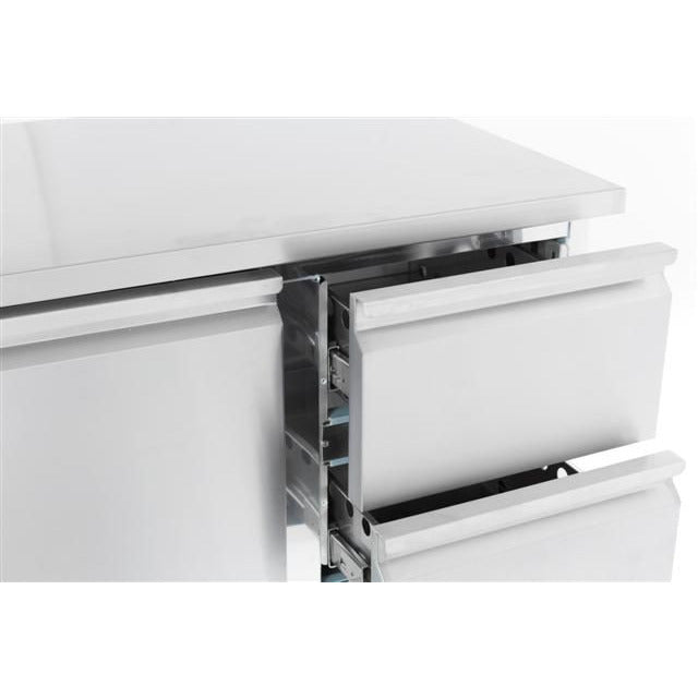 Dim. interior WxDxH (mm) 830x595x456 Type of cooling Static with fan Number of drawers 2 Number of doors 1 Noise level (dB) 48 Defrost Automatic Contents of GN 1x 1/1 GN Gross Capacity (Ltr) 257 EAN code 7435137795773 Type Compact Line Width (mm) 900 Depth (mm) 700 Height (mm) 875 Material Stainless steel 18/8 Gross Weight (kg) 91 Material interior Stainless steel 201 Voltage (Volt) 230 Temperature range (°C) +2 / +8 Cooling agent R 600 A Electrical power (kW) 0.34