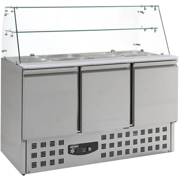 Type of cooling Static with fan Number of doors 3 Net Capacity (Ltr) 368 Noise level (dB) 48 Defrost Automatic Power consumption (Kw/24h) 2.7 Contents of GN 4x 1/1 GN EAN code 7435137796725 Type Compact Line Width (mm) 1365 Depth (mm) 700 Height (mm) 850/1310 Material Stainless steel 18/8 Gross Weight (kg) 125 Material interior Stainless steel 201 Voltage (Volt) 230 Temperature range (°C) +2 / +8 Cooling agent R 600 A Electrical power (kW) 0.34 Frequency (Hz) 50