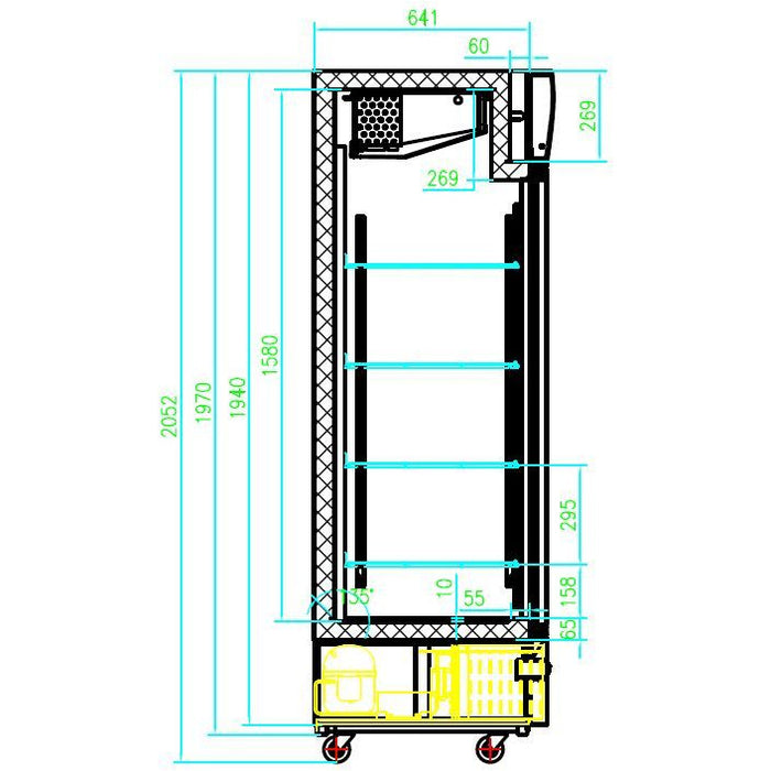 Lockable Yes Type of cooling Ventilated Lighting Yes, LED Number of doors 1 Net Capacity (Ltr) 460 Defrost Automatic Noise level (dB) 50 Max. ambient temperature (°C) 32 Material interior Aluminium Voltage (Volt) 230 Gross Weight (kg) 100 Color Black Material Black painted steel Height (mm) 1990 Depth (mm) 700 Width (mm) 680 EAN code 7435137811879 Number of grids 4x 482x485 Cooling agent R 290 Temperature range (°C) +2/+8