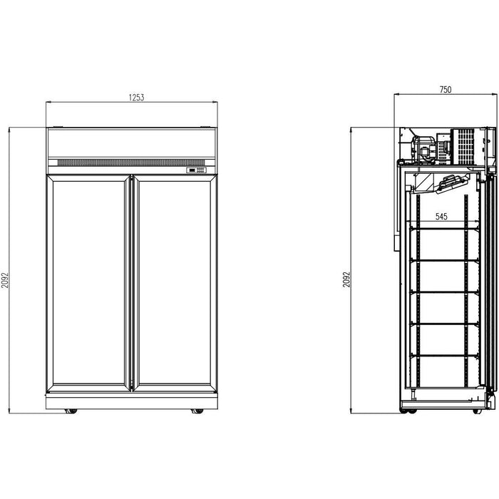 Mobile Yes Lockable No Type of cooling Ventilated Lighting Yes, LED Number of doors 2 Dim. interior WxDxH (mm) 1163x545x1569 Dimensions light box WxH (mm) 1253x280 Insulation thickness (mm) 45 Power consumption (Kw/24h) 5,2 Net Capacity (Ltr) 1000 Defrost Automatic Noise level (dB) 60 Max. ambient temperature (°C) 38 Voltage (Volt) 230 Gross Weight (kg) 202 Accessories included 4 castors and 10 grids with clips and price card holders Color White Electrical power (kW) 0,48 Height (mm) 2092 Depth (mm) 710 Width (mm) 1253 EAN code 7435137867890 Number of grids 10 Max. grid load (kg) 30 Guides distance (mm) 90 Number of guide pairs 3 per door Cooling agent R 290 Temperature range (°C) 0/+10