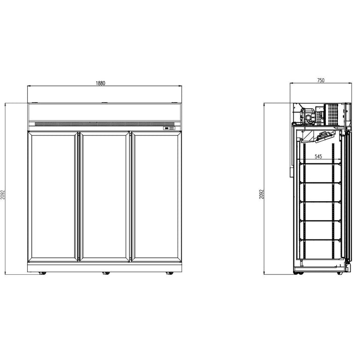 Mobile Yes Lockable No Type of cooling Ventilated Lighting Yes, LED Number of doors 3 Dim. interior WxDxH (mm) 1790x545x1569 Dimensions light box WxH (mm) 1880x280 Insulation thickness (mm) 45 Power consumption (Kw/24h) 7,84 Net Capacity (Ltr) 1530 Defrost Automatic Noise level (dB) 60 Max. ambient temperature (°C) 38 Voltage (Volt) 230 Net weight(kg) 242 Gross Weight (kg) 282 Accessories included 6 castors and 15 grids with clips and price card holders Color White Electrical power (kW) 0,74 Height (mm) 2092 Depth (mm) 710 Width (mm) 1880 EAN code 7435137868811 Number of grids 15 Max. grid load (kg) 30 Guides distance (mm) 90 Number of guide pairs 3 per door Cooling agent R 290 Temperature range (°C) 0/+10