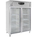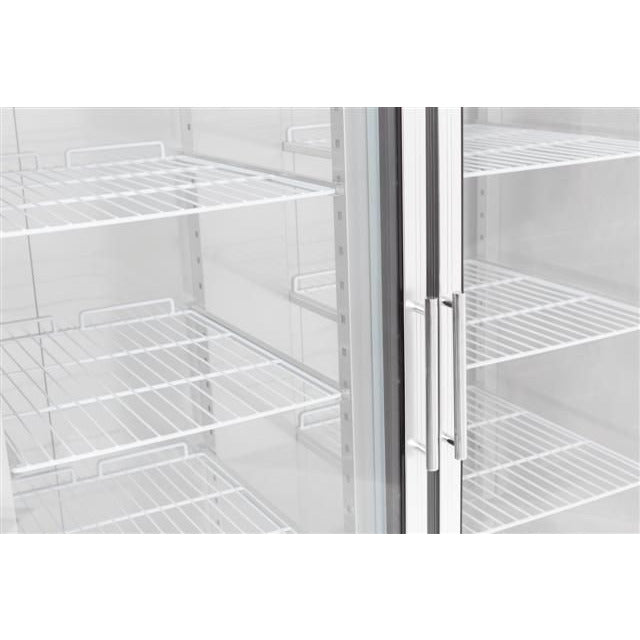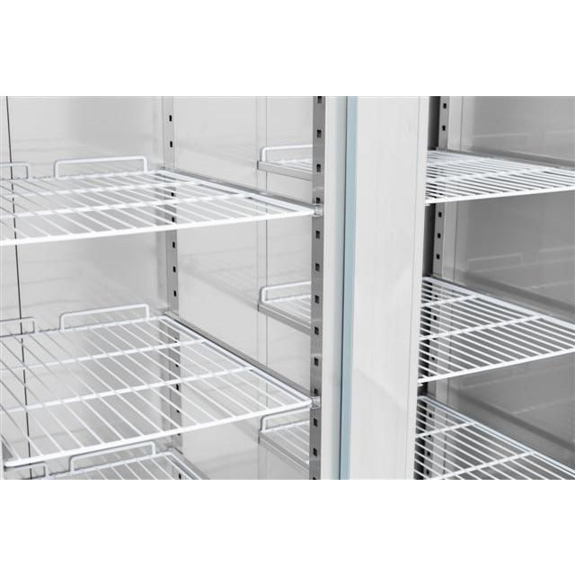 Lockable Yes Type of cooling Ventilated Number of doors 2 Dim. interior WxDxH (mm) 1360x685x1390 Insulation thickness (mm) 60 Net Capacity (Ltr) 1325 Defrost Automatic Noise level (dB) 48 Door reversible No Max. ambient temperature (°C) 30 Material interior Stainless steel 304 Voltage (Volt) 230 Gross Weight (kg) 208 Color Stainless steel Material Stainless steel AISI 304 Electrical power (kW) 0.53 Height (mm) 2010 Depth (mm) 830 Width (mm) 1480 Type Standard Line EAN code 7435137891840 Number of grids 6 x 2/1 GN Guides distance (mm) 80 Number of guide pairs 23 Cooling agent R 290 Temperature range (°C) +2 / +8