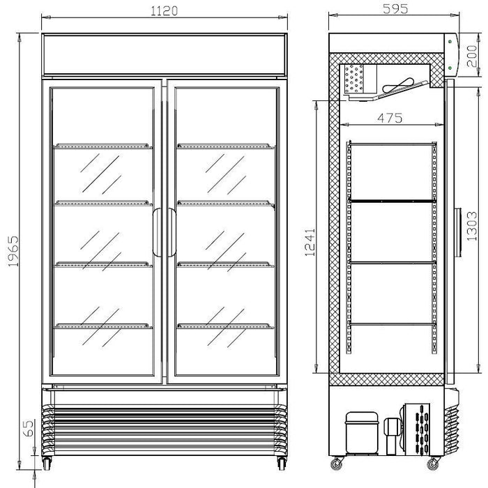 Lighting Yes, LED Type of cooling Ventilated Gross Capacity (Ltr) 750 Number of doors 2 Noise level (dB) 45 Defrost Automatic Max. ambient temperature (°C) 25 EAN code 7435137794707 Width (mm) 1120 Depth (mm) 610 Height (mm) 1965 Gross Weight (kg) 120 Power consumption (Kw/24h) 6.5 Voltage (Volt) 230 Electrical power (kW) 0,45 Cooling agent R 290 Temperature range (°C) +2/+10 Number of grids 8 Insulation thickness (mm) 45